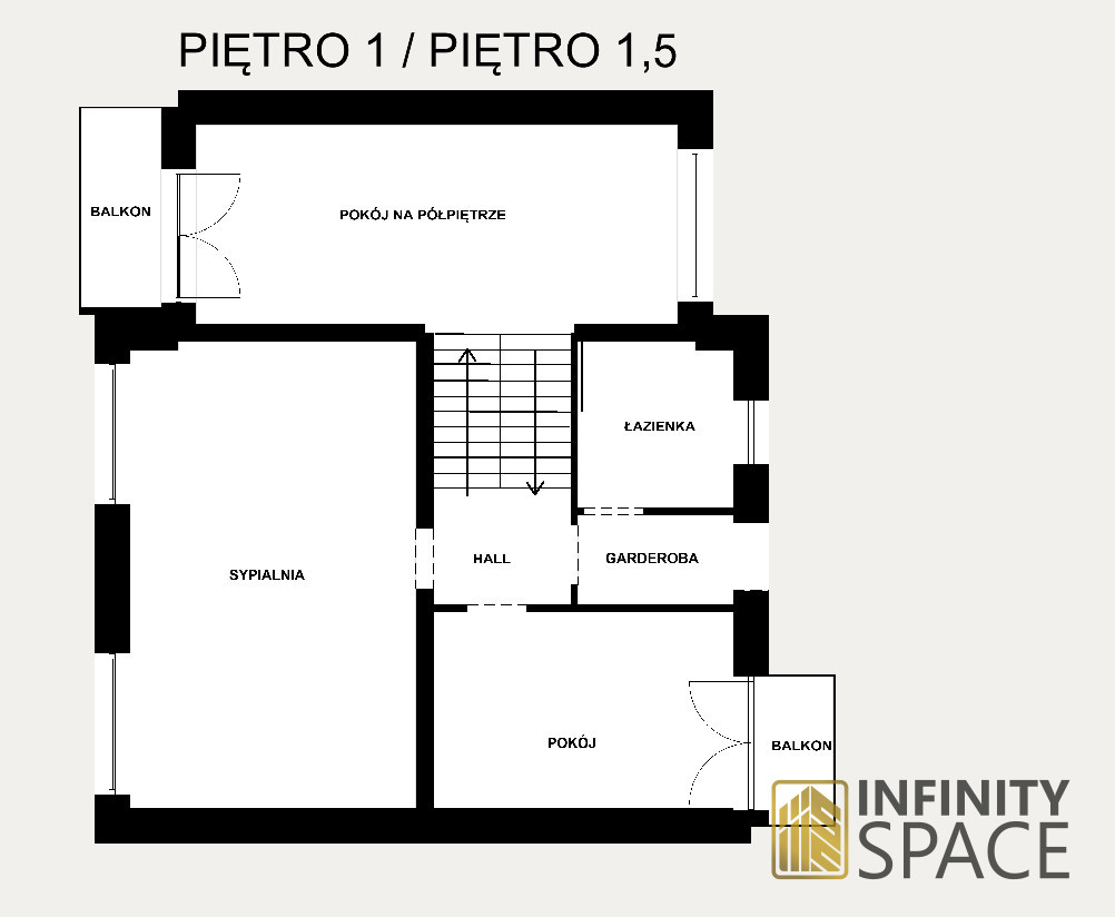 - pierwszego piętra gdzie znajdują się dwa pokoje (w tym jeden z balkonem), garderoba i łazienka. Warto powiedzieć, że pokoje mają po 30 m2 i dużo okien co powoduje możliwość wydzielenia większej ilości pomieszczeń.