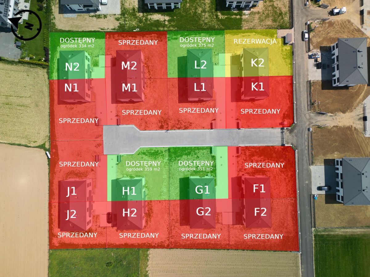Każdy z domów posiada prywatny ogrodzony ogródek o powierzchni zielonej między 315 m2, a 420 m2. Podane powierzchnie nie obejmują gruntu pod budynkiem oraz gruntu pod sięgaczem (wybrukowanym białą kostką placem przed każdym z budynków).