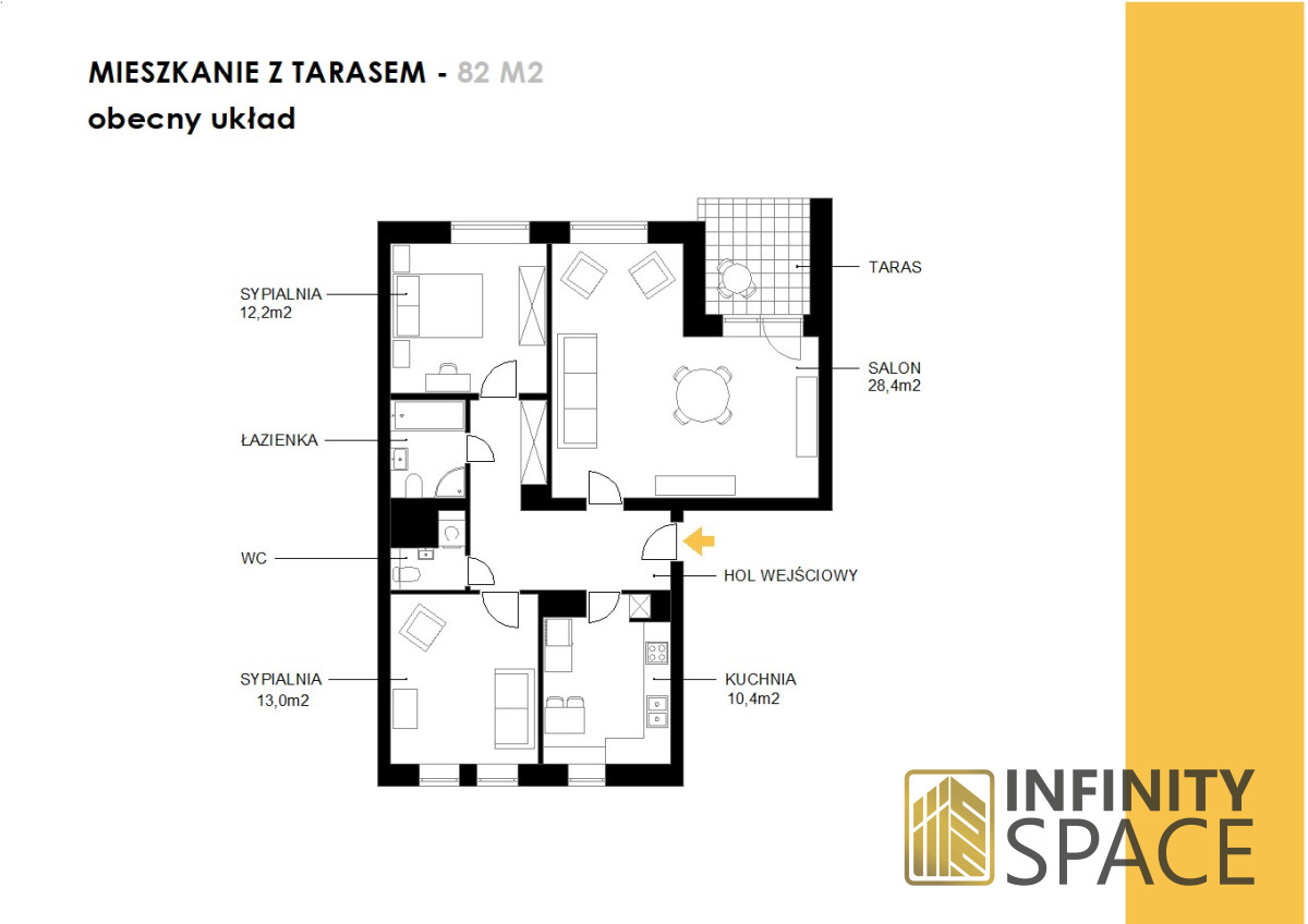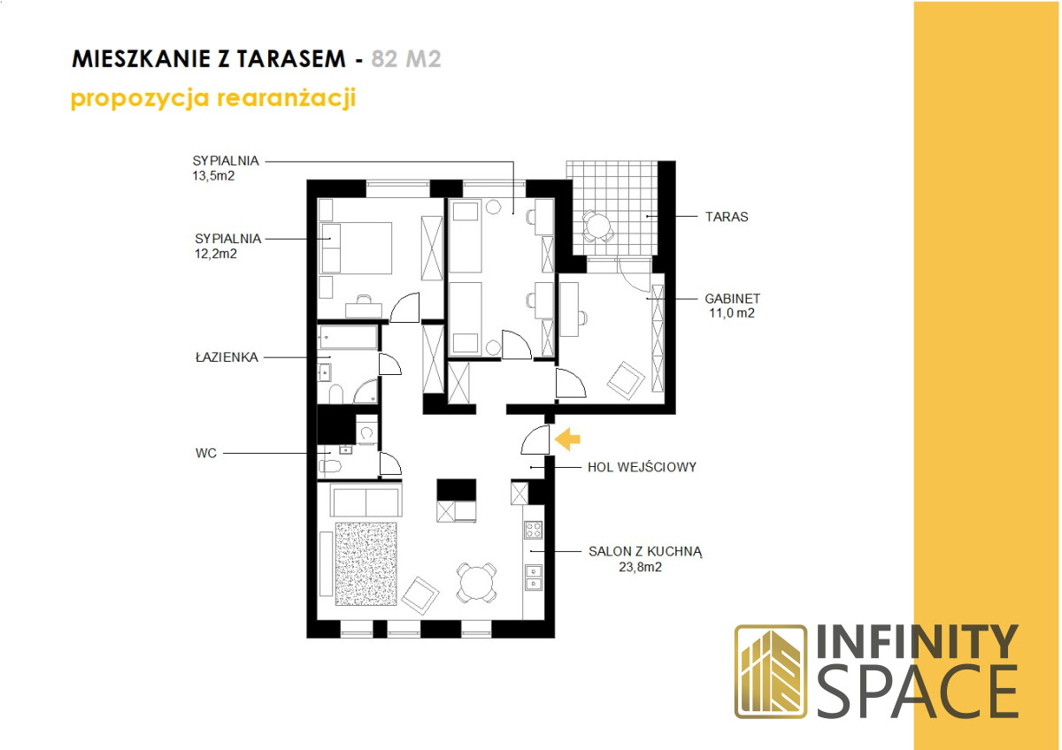 Istnieje możliwość przearanżowania mieszkania w taki sposób, aby wygospodarować trzecią sypialnię.