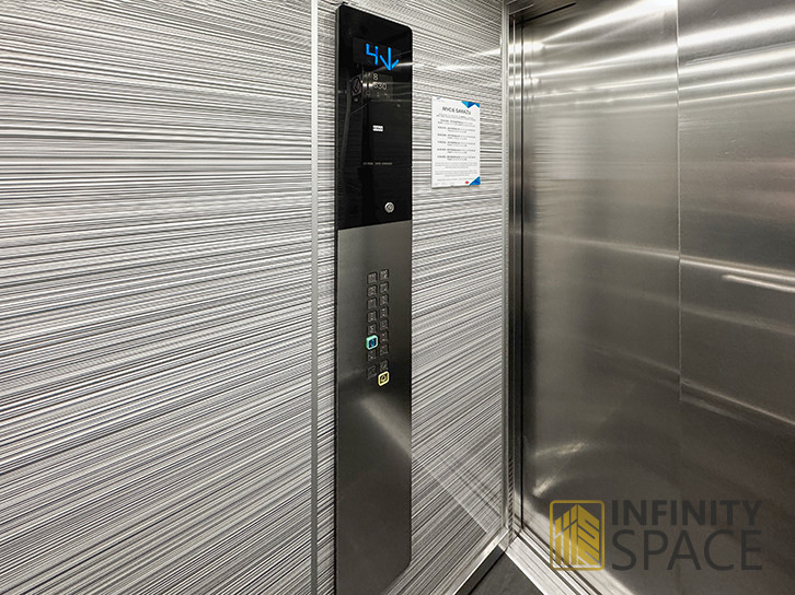 The building features modern architecture, elegant common areas, and a well-maintained staircase.