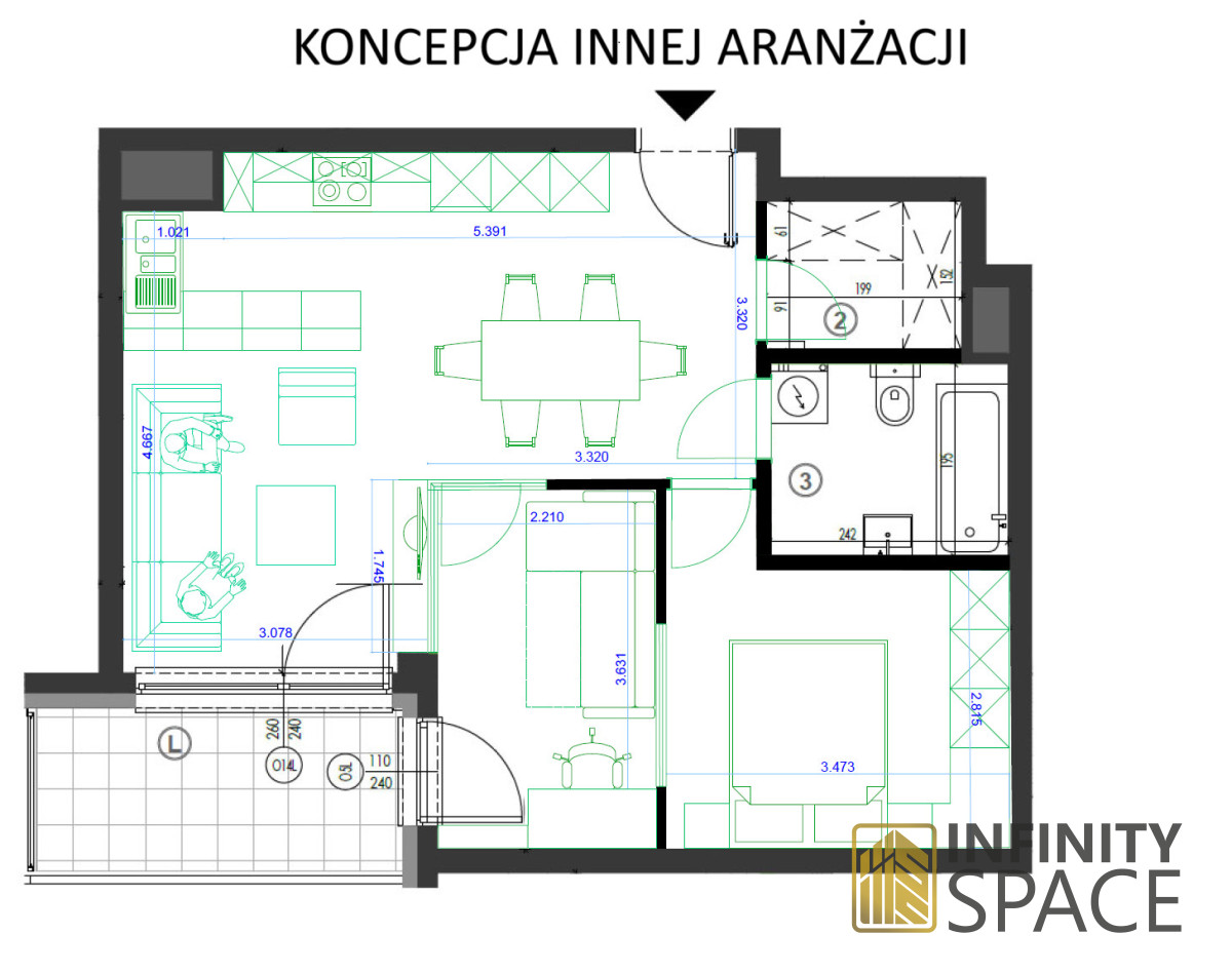 Większość ścian wewnętrznych to ściany działowe - układ mieszkania można dowolnie zmienić. Istnieje możliwość wygospodarowania dodatkowego, trzeciego pokoju (np. gabinetu) - propozycja została pokazana na koncepcji zagospodarowania załączonej do oferty.