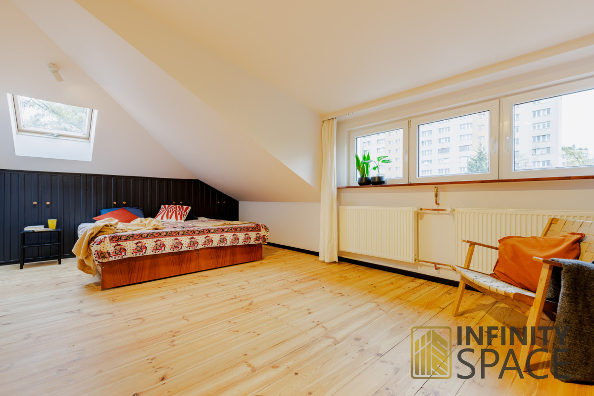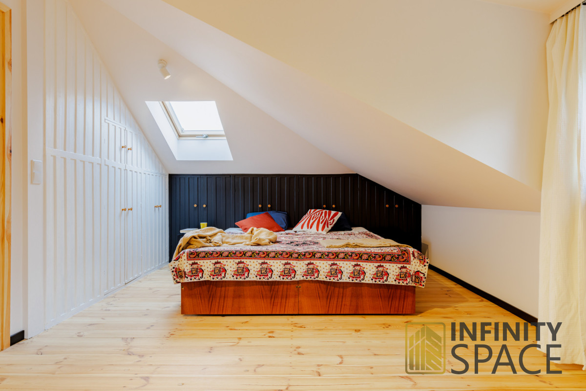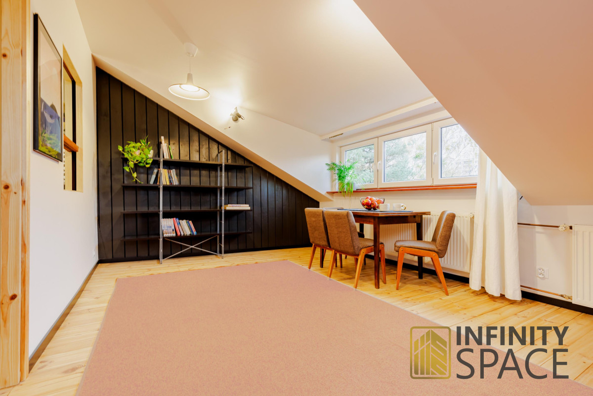 The apartment is bright, the living room is located on the west side, the bedroom on the east side. Both rooms are large - they have a similar size of 25 and 26 m2 and plenty of storage space in the numerous closets located under the slants. This solution means that there is a lot of free - uncluttered space in the apartment.