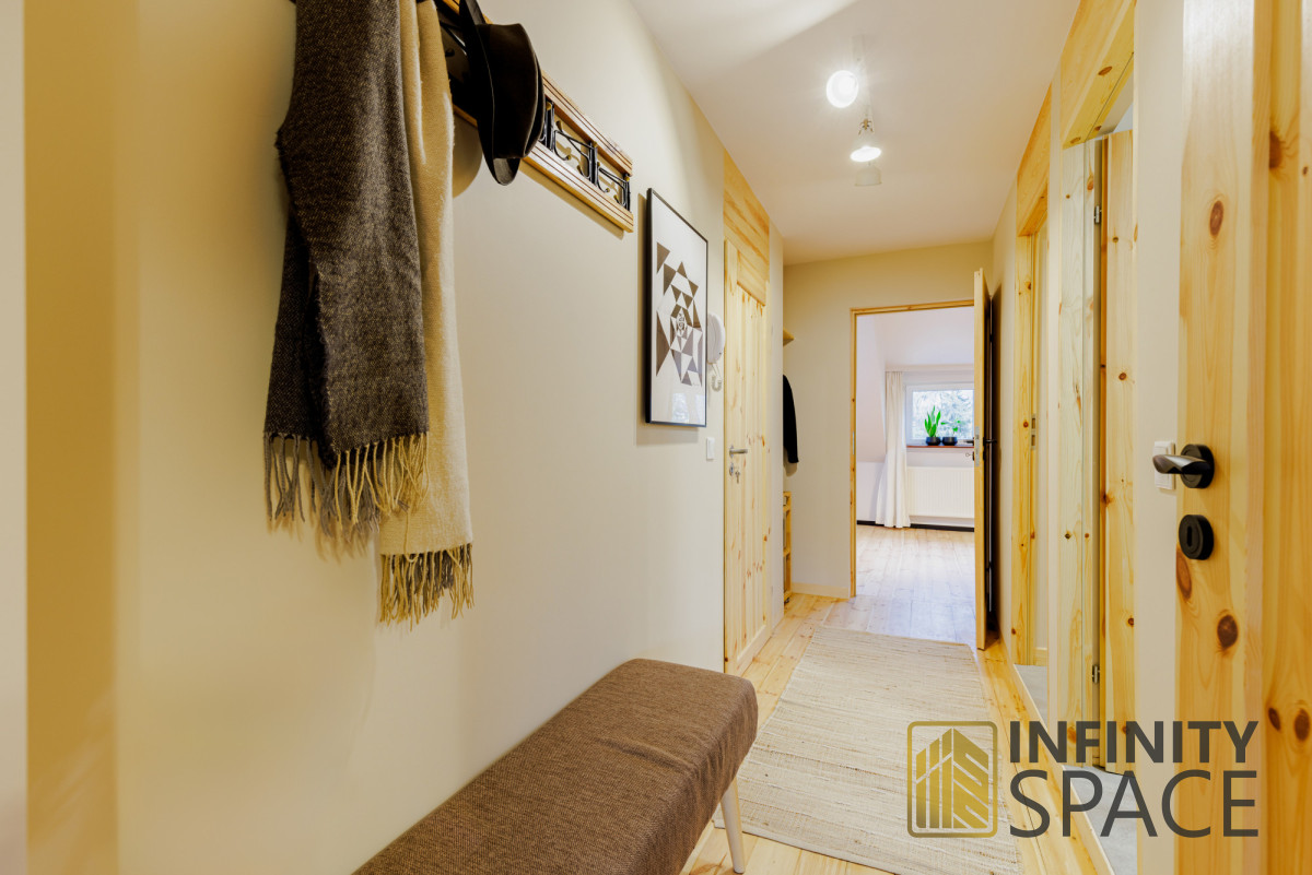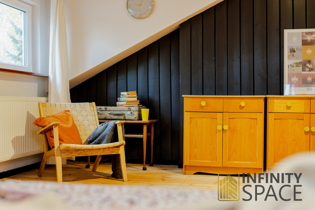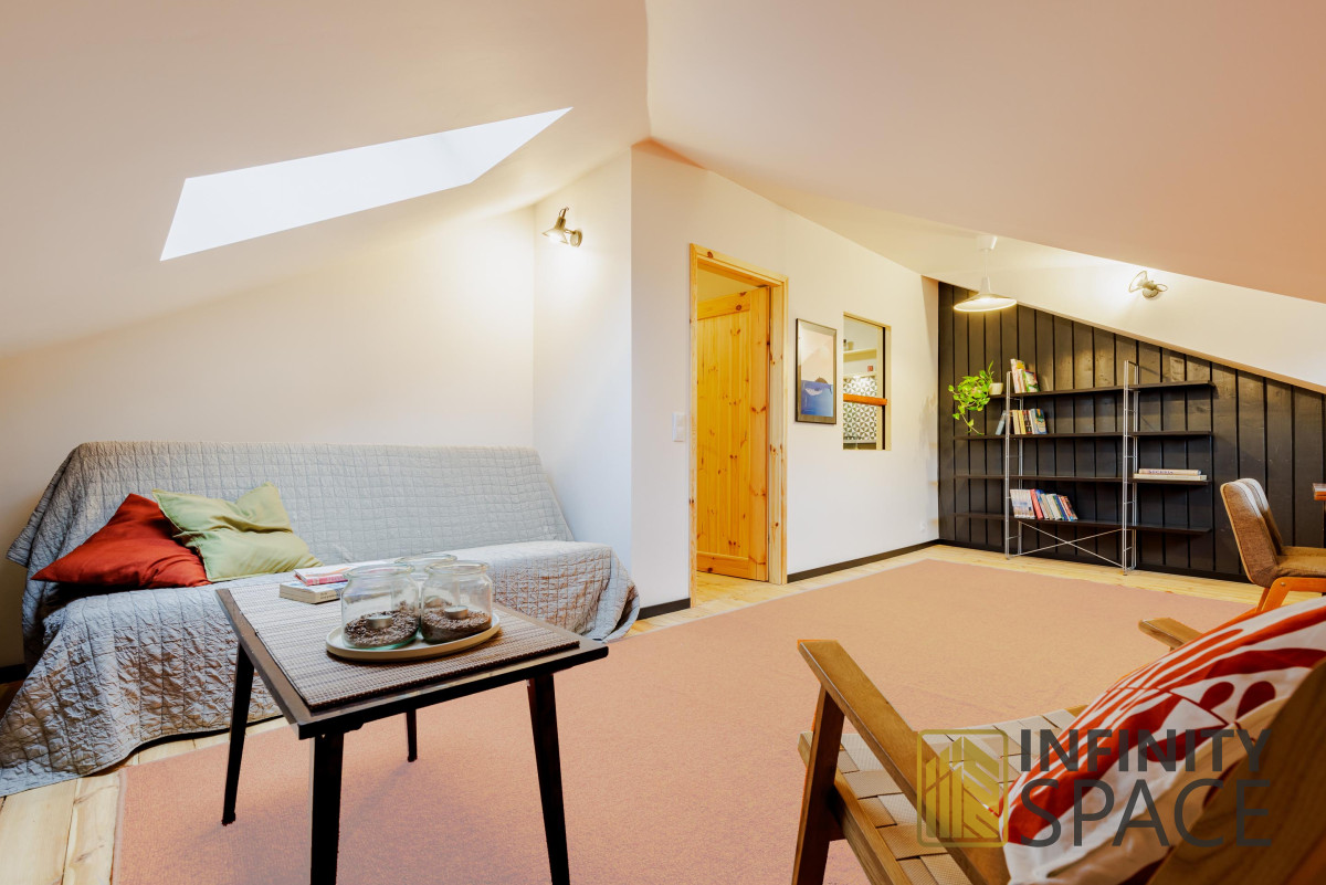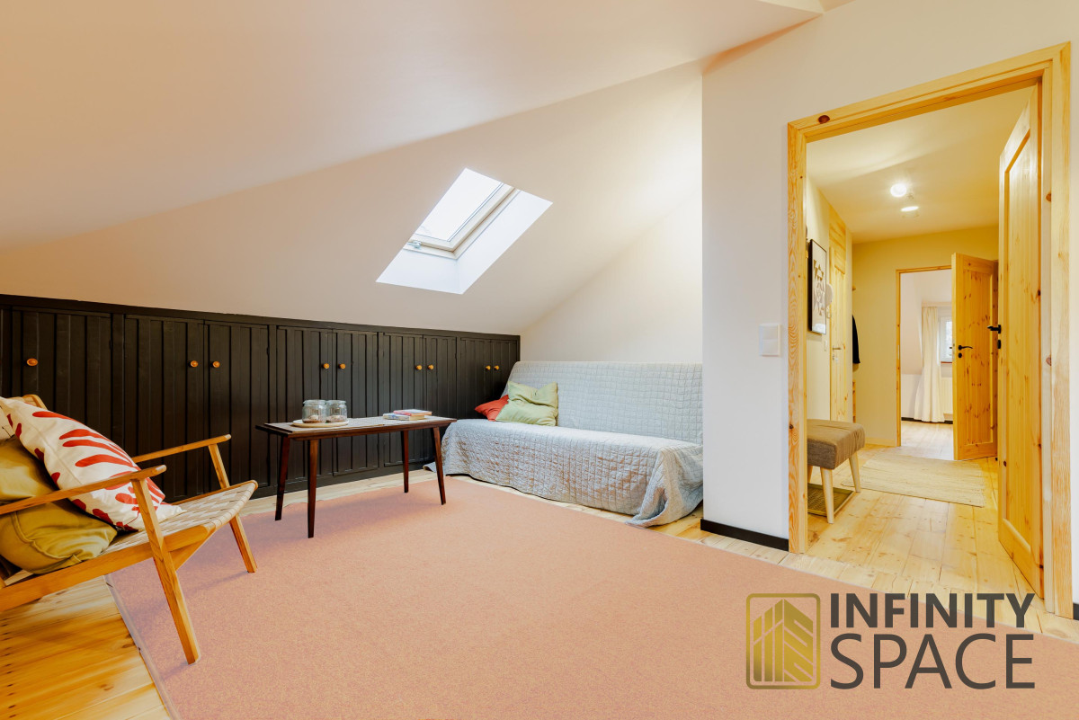 The apartment is bright, the living room is located on the west side, the bedroom on the east side. Both rooms are large - they have a similar size of 25 and 26 m2 and plenty of storage space in the numerous closets located under the slants. This solution means that there is a lot of free - uncluttered space in the apartment.