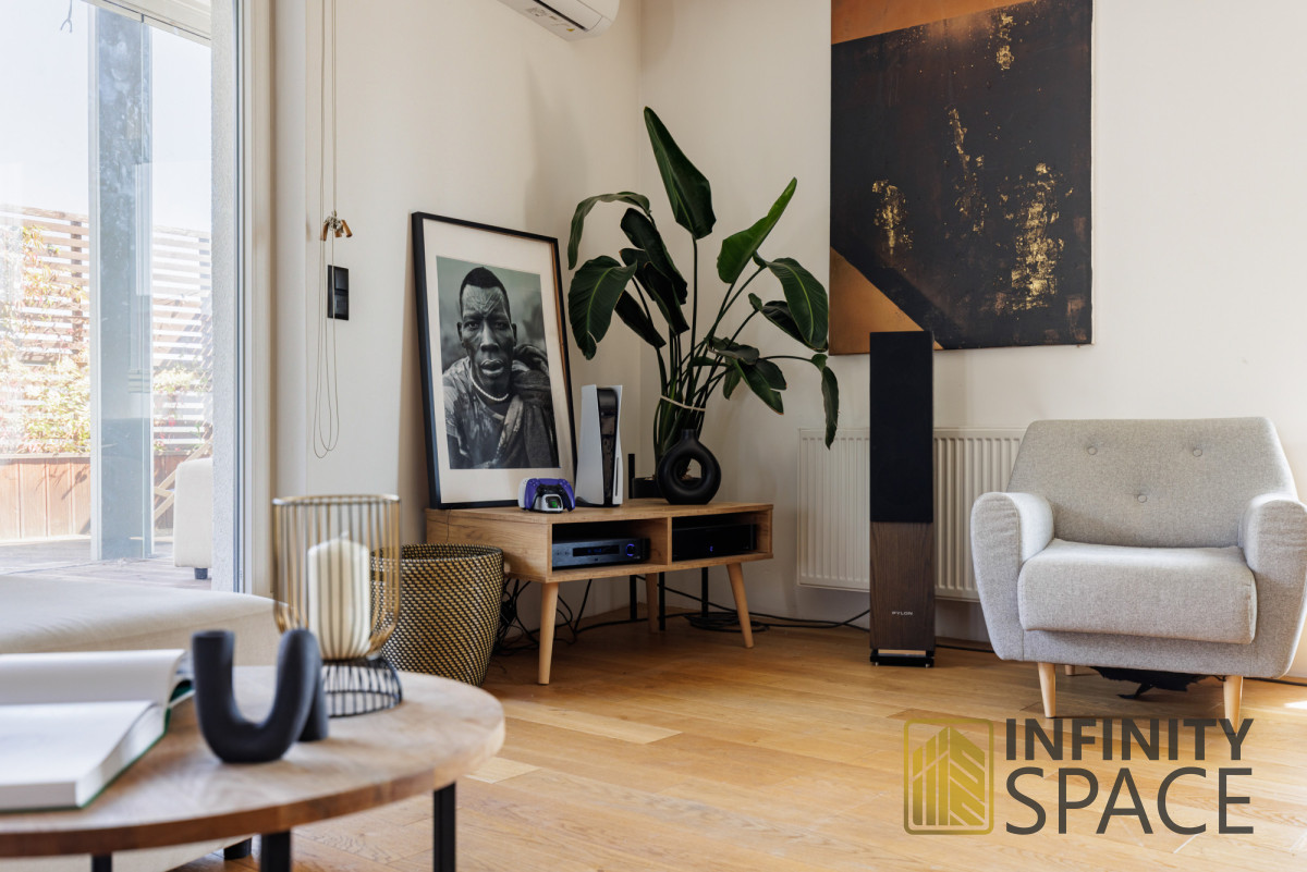 A comfortable, spacious, modern, and fully equipped PREMIUM apartment in the “Dom Saski” development, with an area of 81 m2, located on the top third floor of an intimate three-story building with an elevator. The east-south exposure and large, bright windows guarantee good lighting. The apartment was designed by an interior designer and finished to a high standard, with custom-made woodwork made from the highest quality materials. The premises are very quiet. The apartment is equipped with high-end household appliances. It has an extremely functional layout, air conditioning, and an electric projection screen.