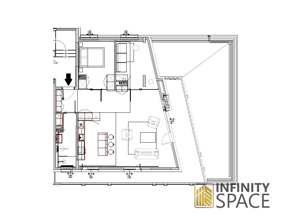 - pokój dzienny z aneksem kuchennym i wyjściem na taras