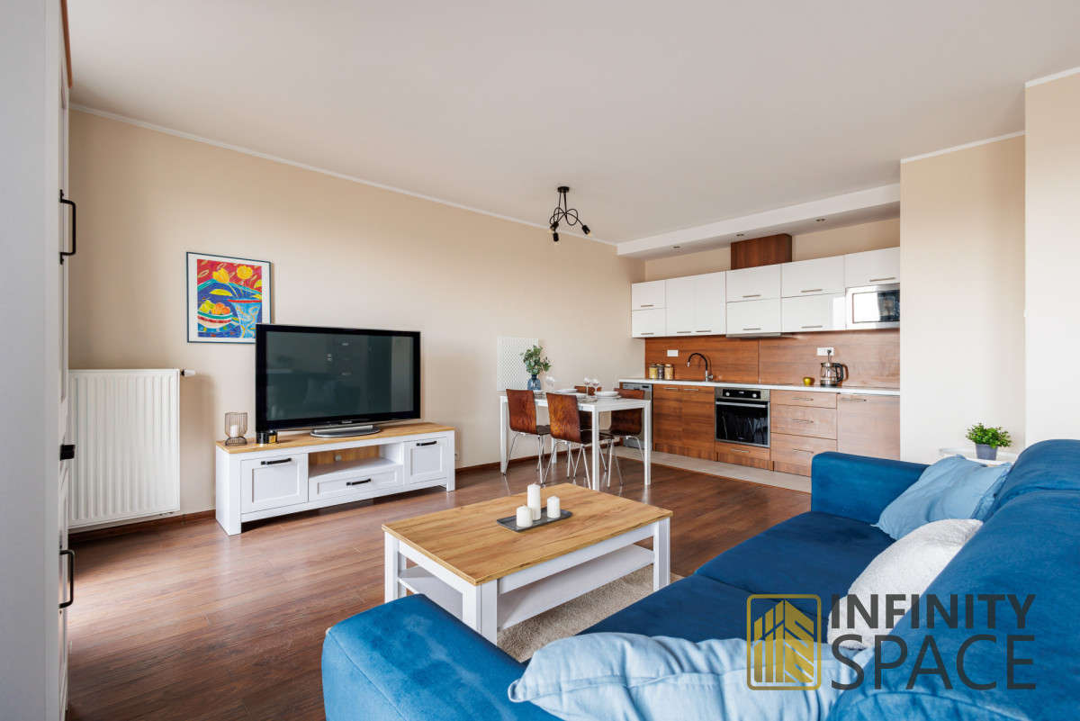 - przestronny salon z aneksem kuchennym tworzy harmonijną strefę dzienną, idealną zarówno do wypoczynku, jak i pracy. W salonie znajduje się rozkładana sofa, szafką RTV i telewizor 55', duży stół oraz komody do przechowywania,