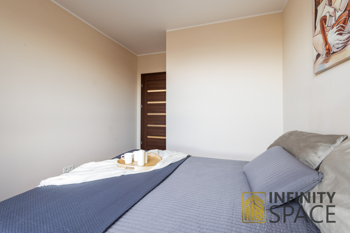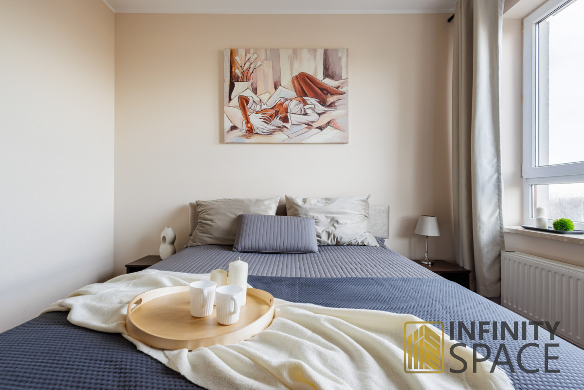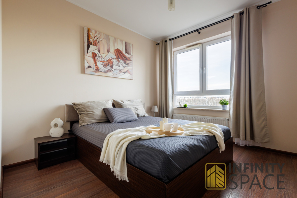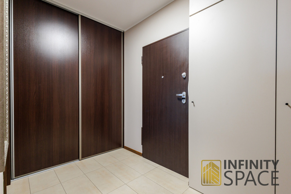 The 55 m² apartment is located on the high 6th floor. It has been designed with comfort and functionality in mind. Thanks to large north-facing windows, the flat is very well lit. The premises are quiet, bright and cosy.