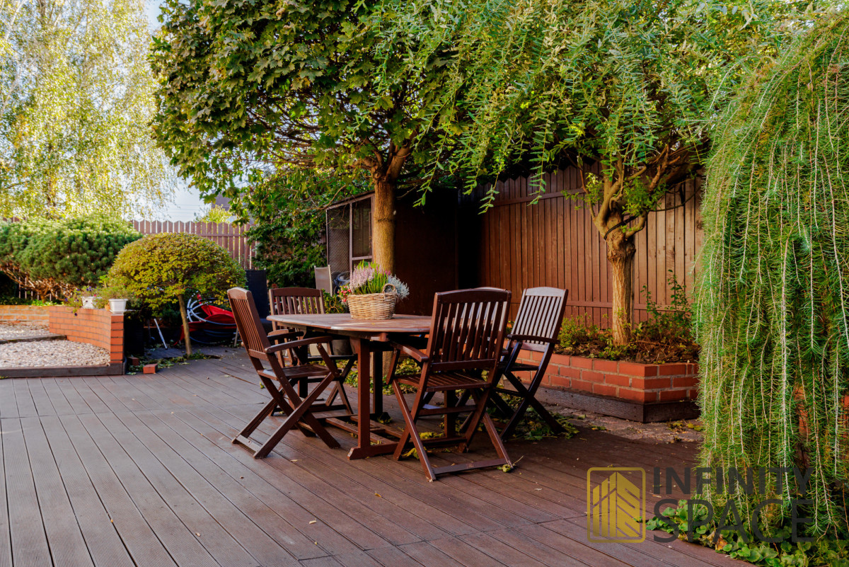 Na ogrodzie znajdziemy drewniany taras z miejscem do grillowania i biesiadowania.