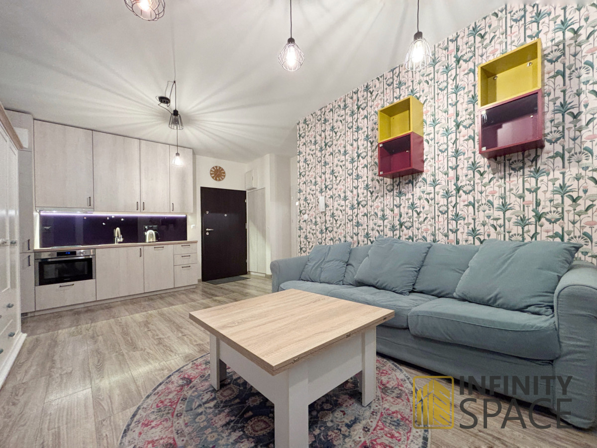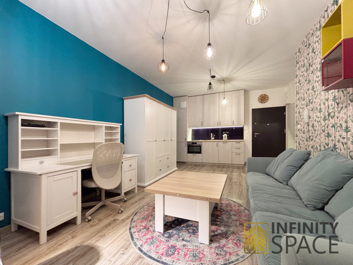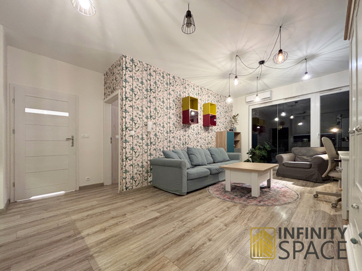 For rent: a functional, two-room, air-conditioned apartment with a balcony, located in a modern residential complex right next to the “Młociny” metro station.