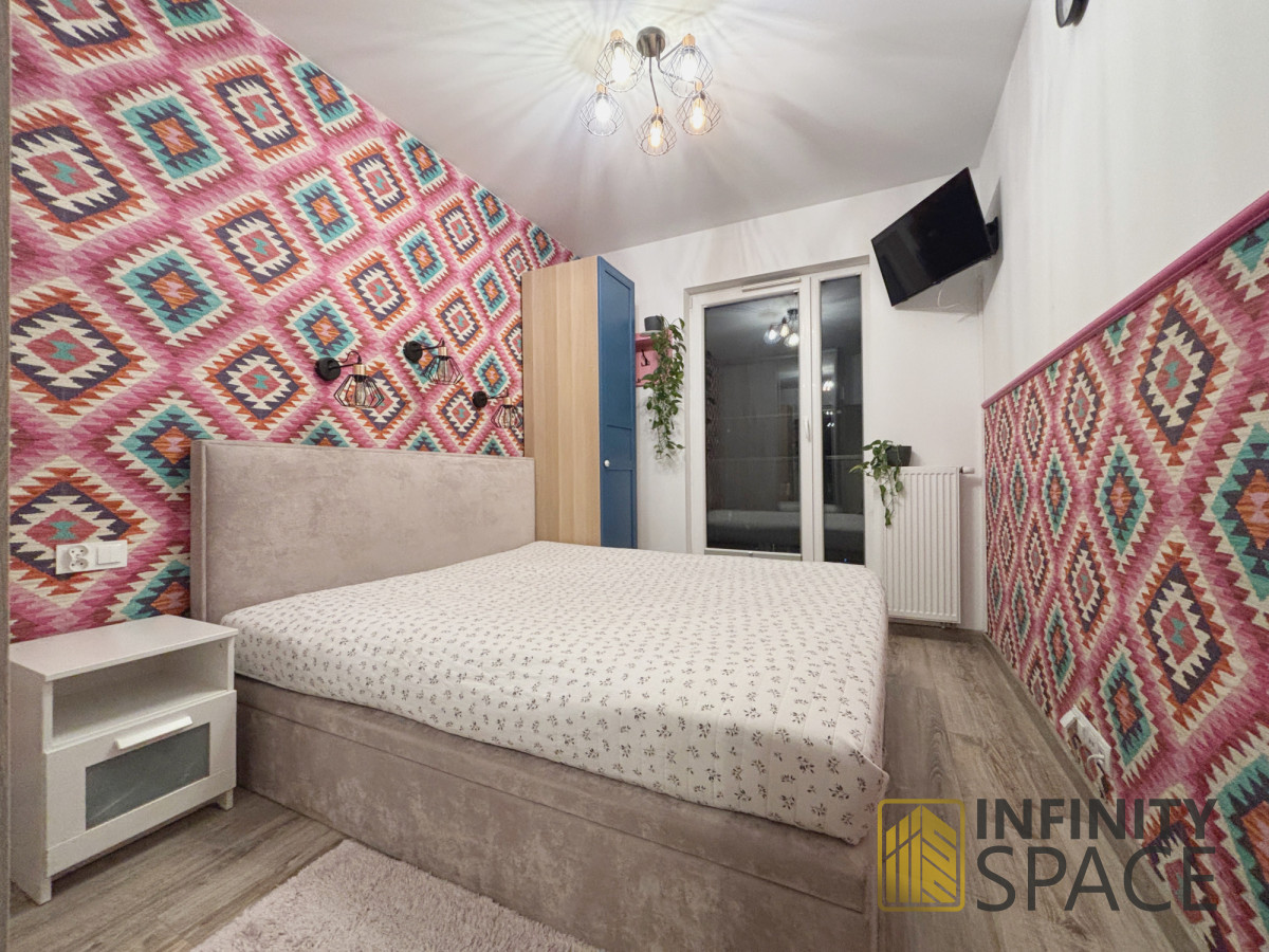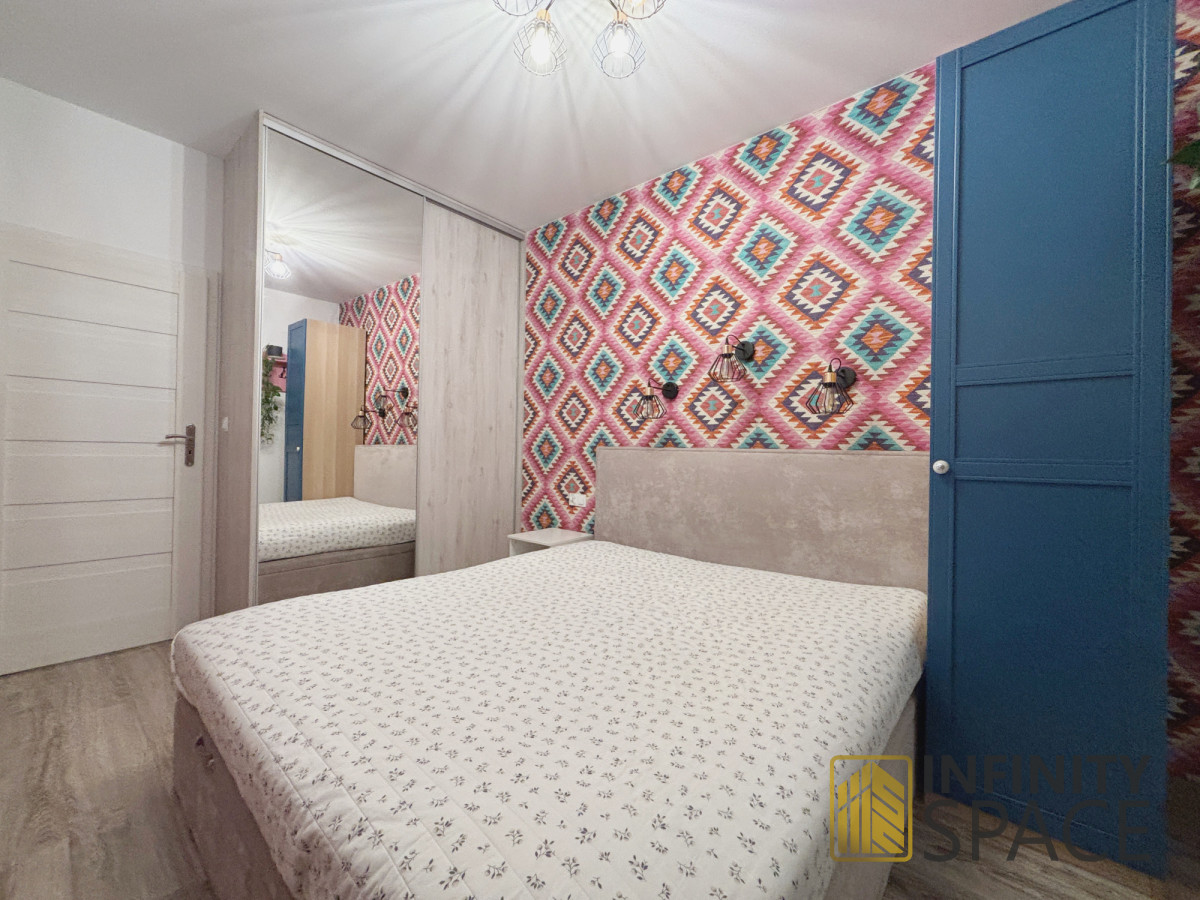 - bedroom (12 m²) with a double bed and a large wardrobe,