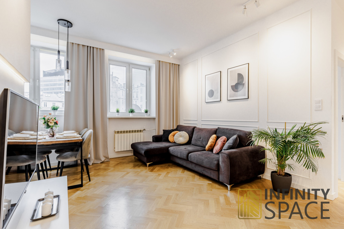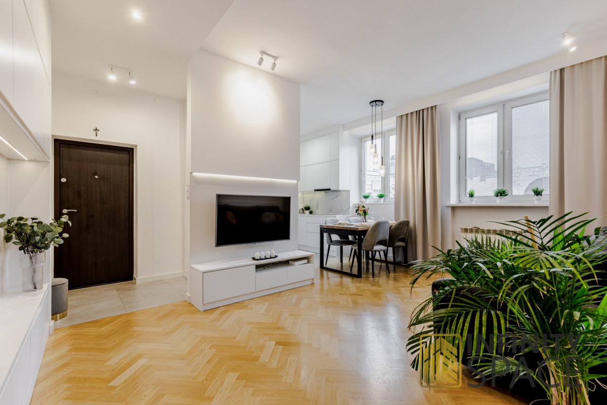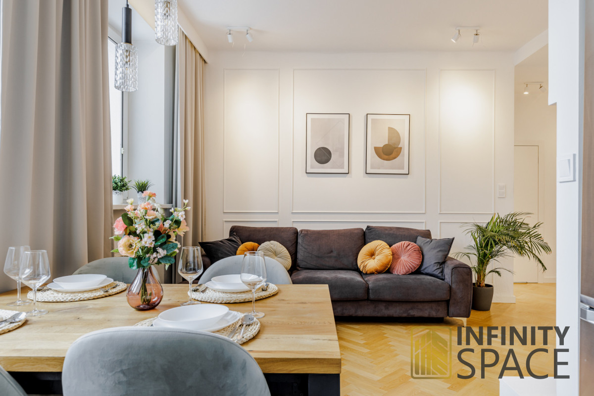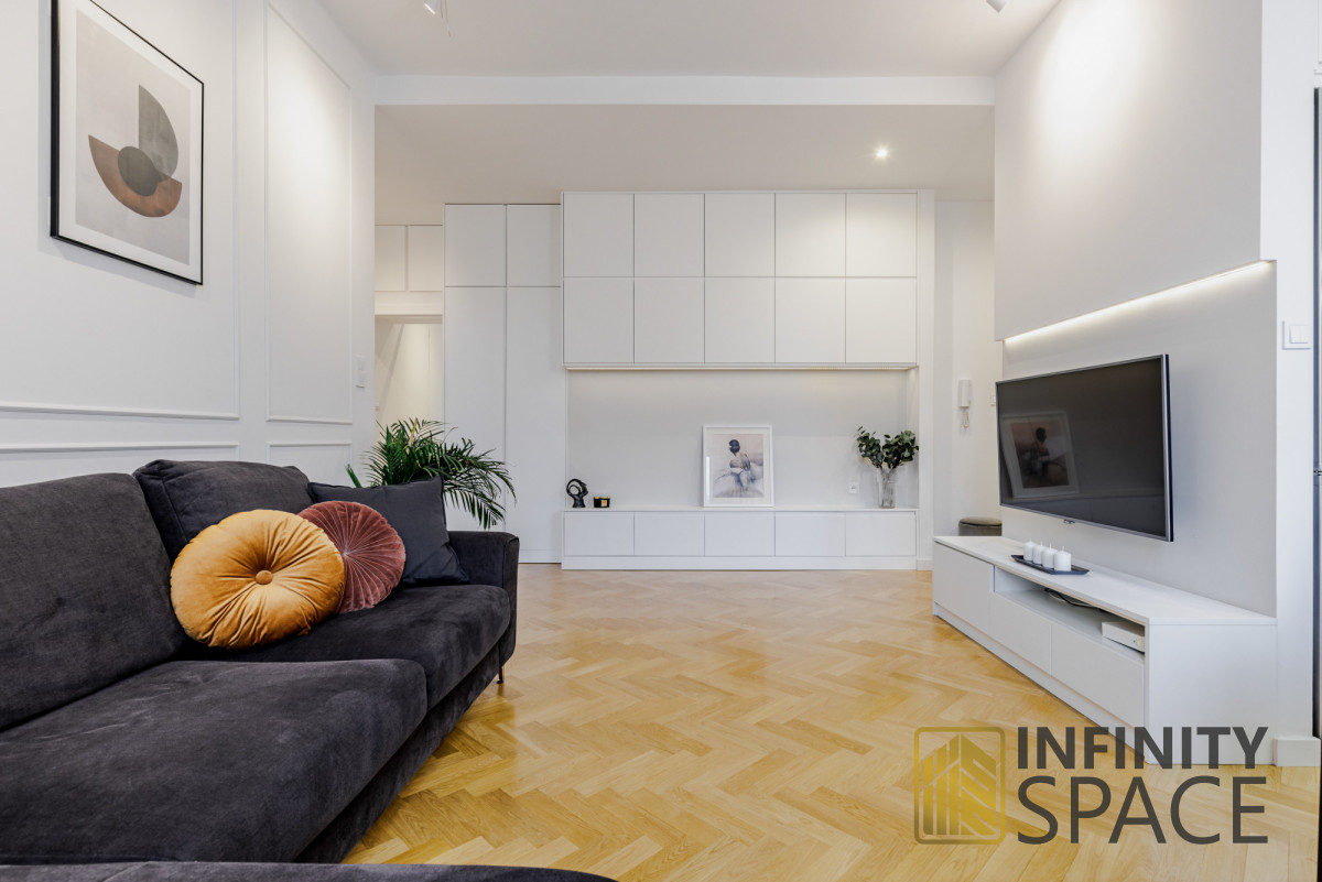 Drewniany piękny dębowy parkiet i szafki robione na wymiar idealnie komponują się z jakże kultową lokalizacją, w której jest zlokalizowane mieszkanie.