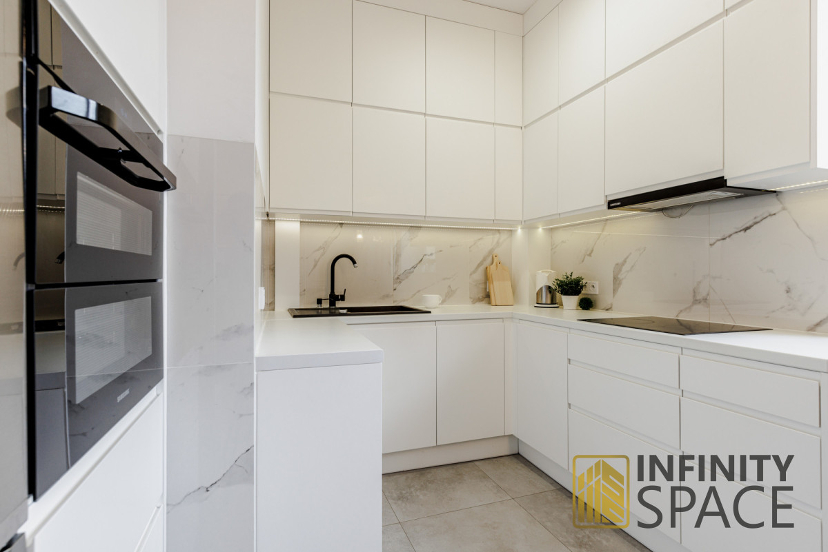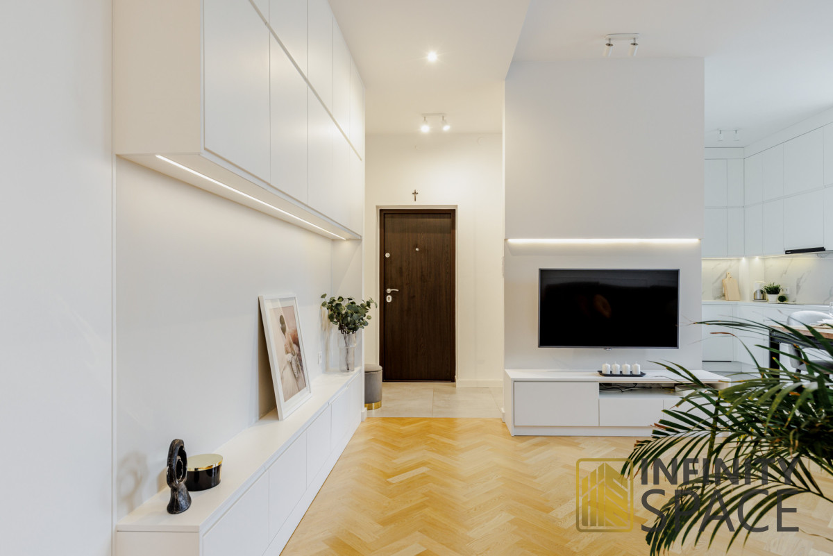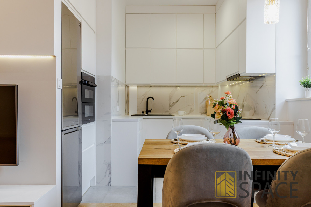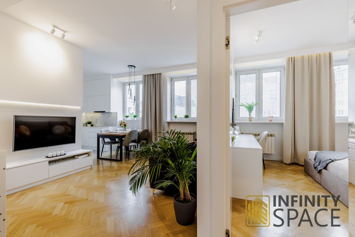 Drewniany piękny dębowy parkiet i szafki robione na wymiar idealnie komponują się z jakże kultową lokalizacją, w której jest zlokalizowane mieszkanie.