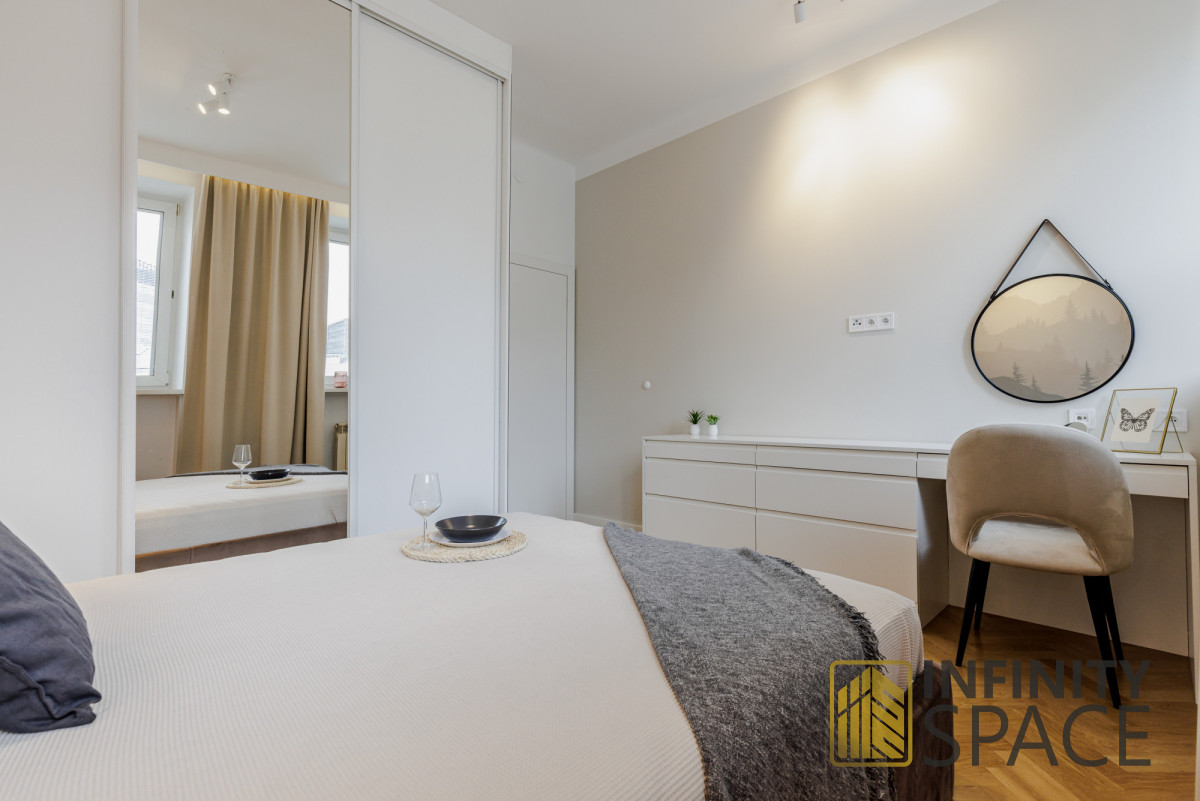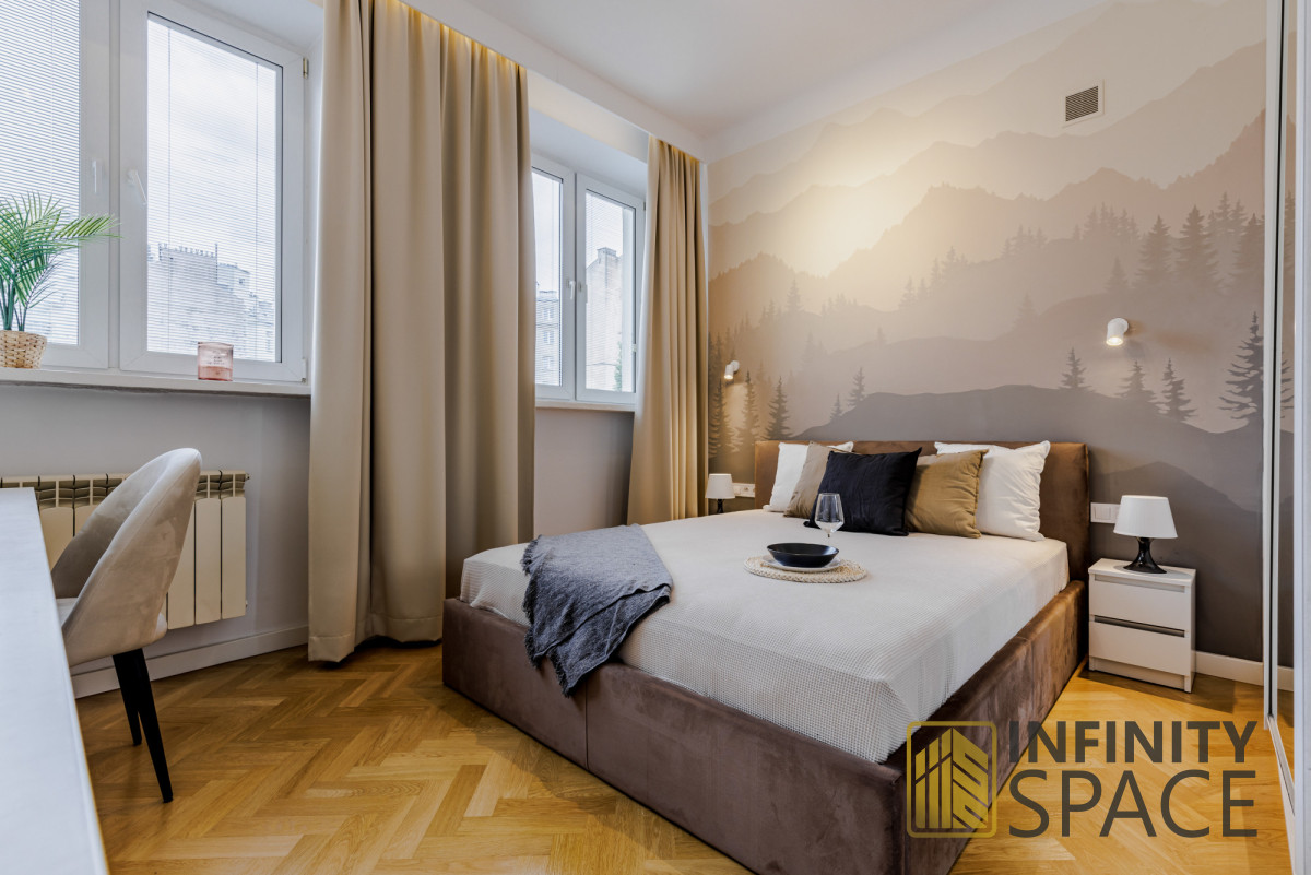 - sypialni z dużym, wygodnym łóżkiem małżeńskim oraz dużą szafą, z ekspozycją okien na ciche podwórze,