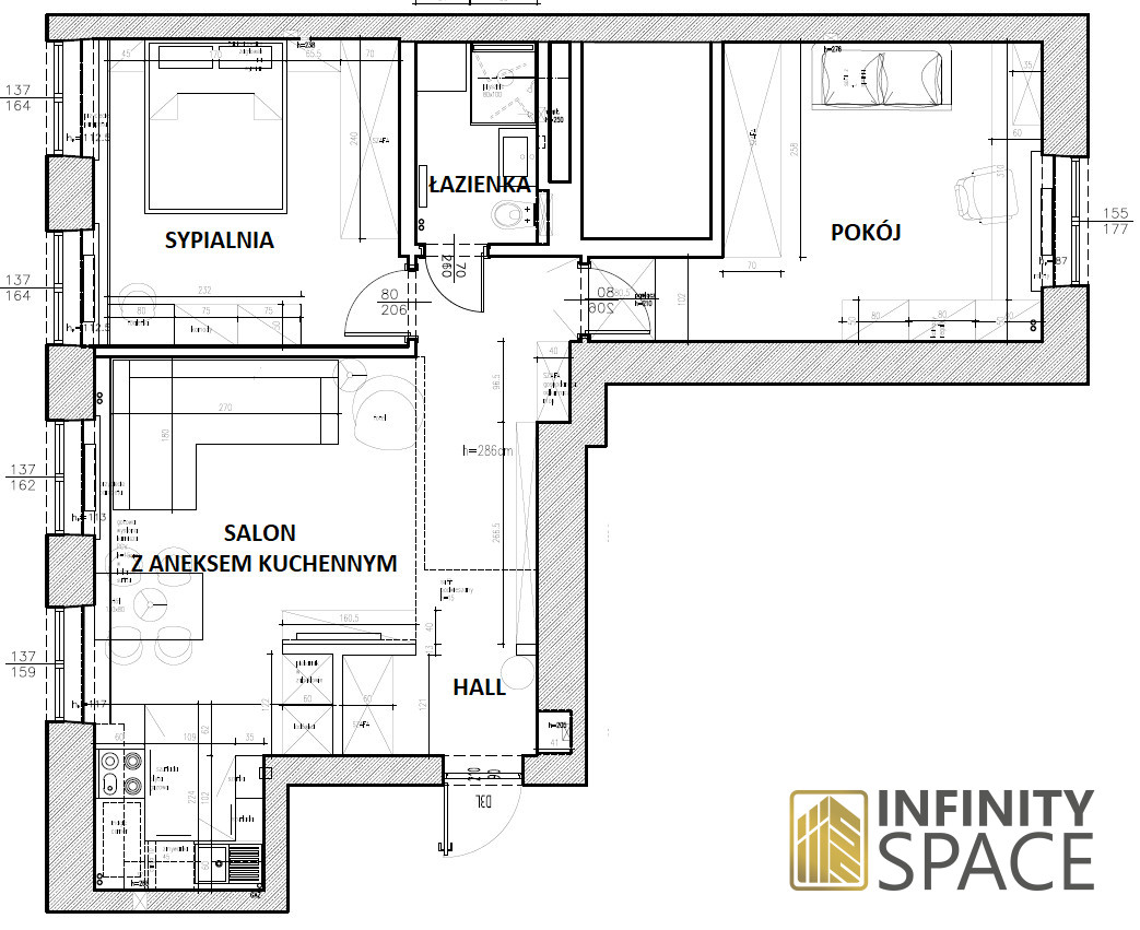 - pokoju dziennego z dużym narożnikiem i TV, połączonego z otwartą kuchnią i jadalnią,