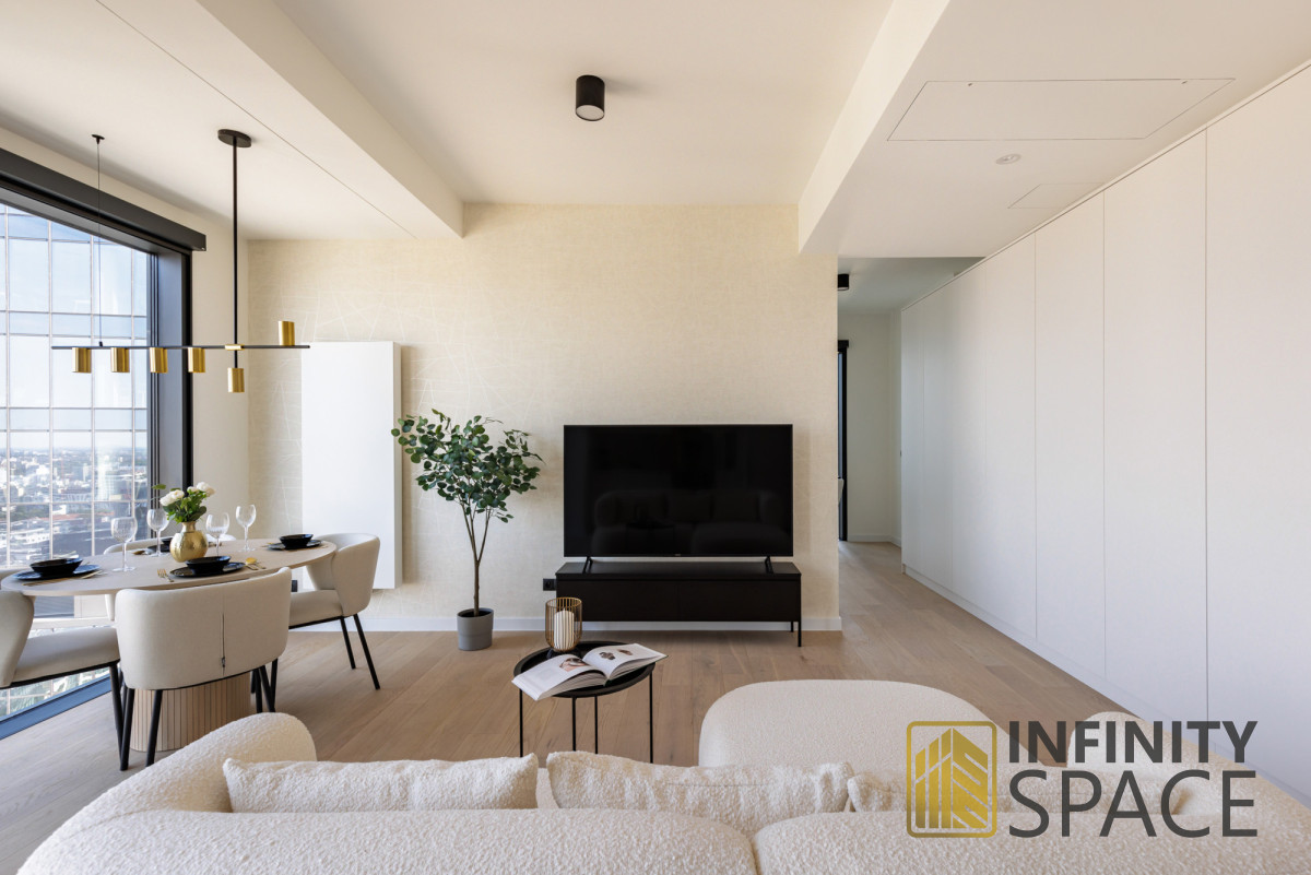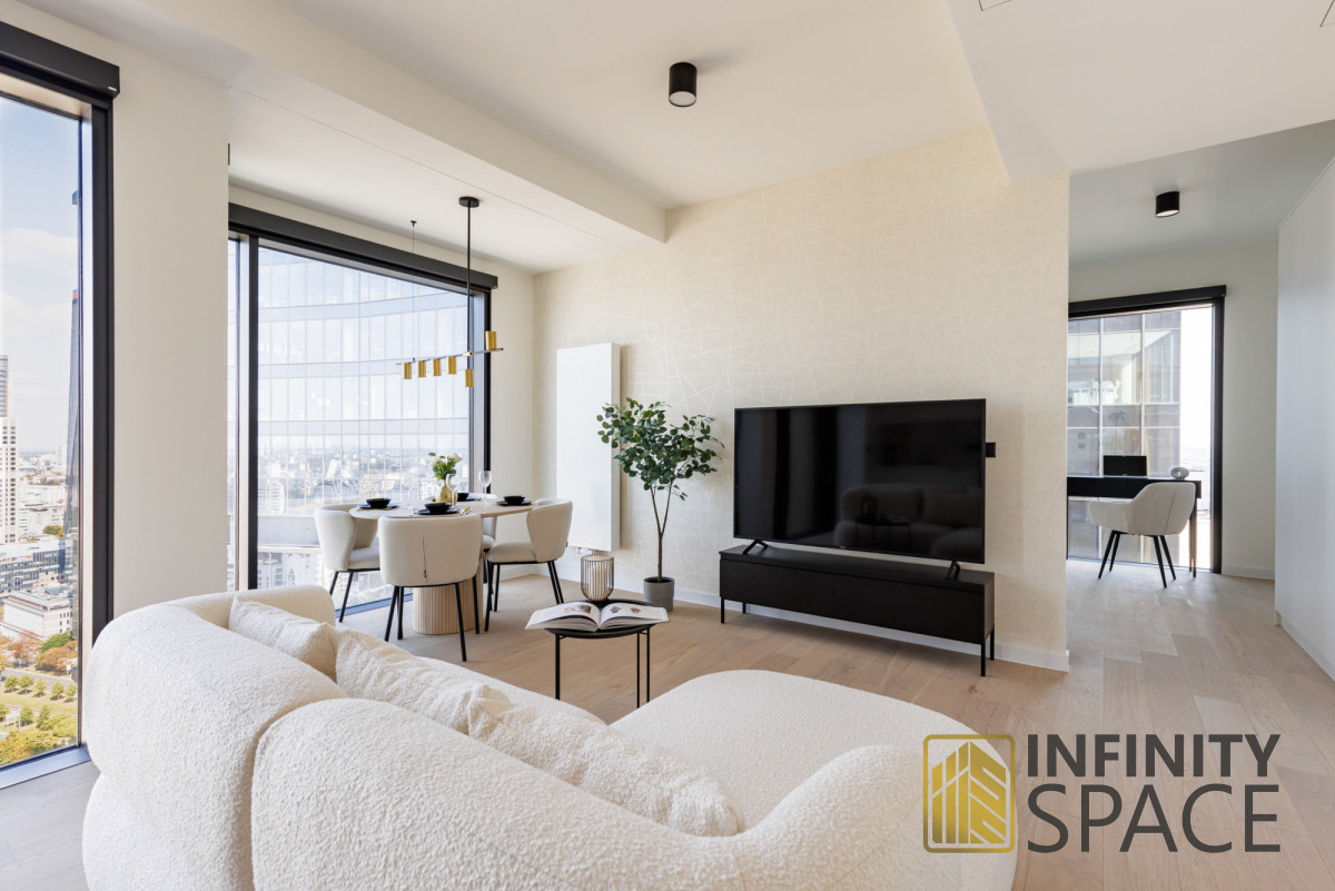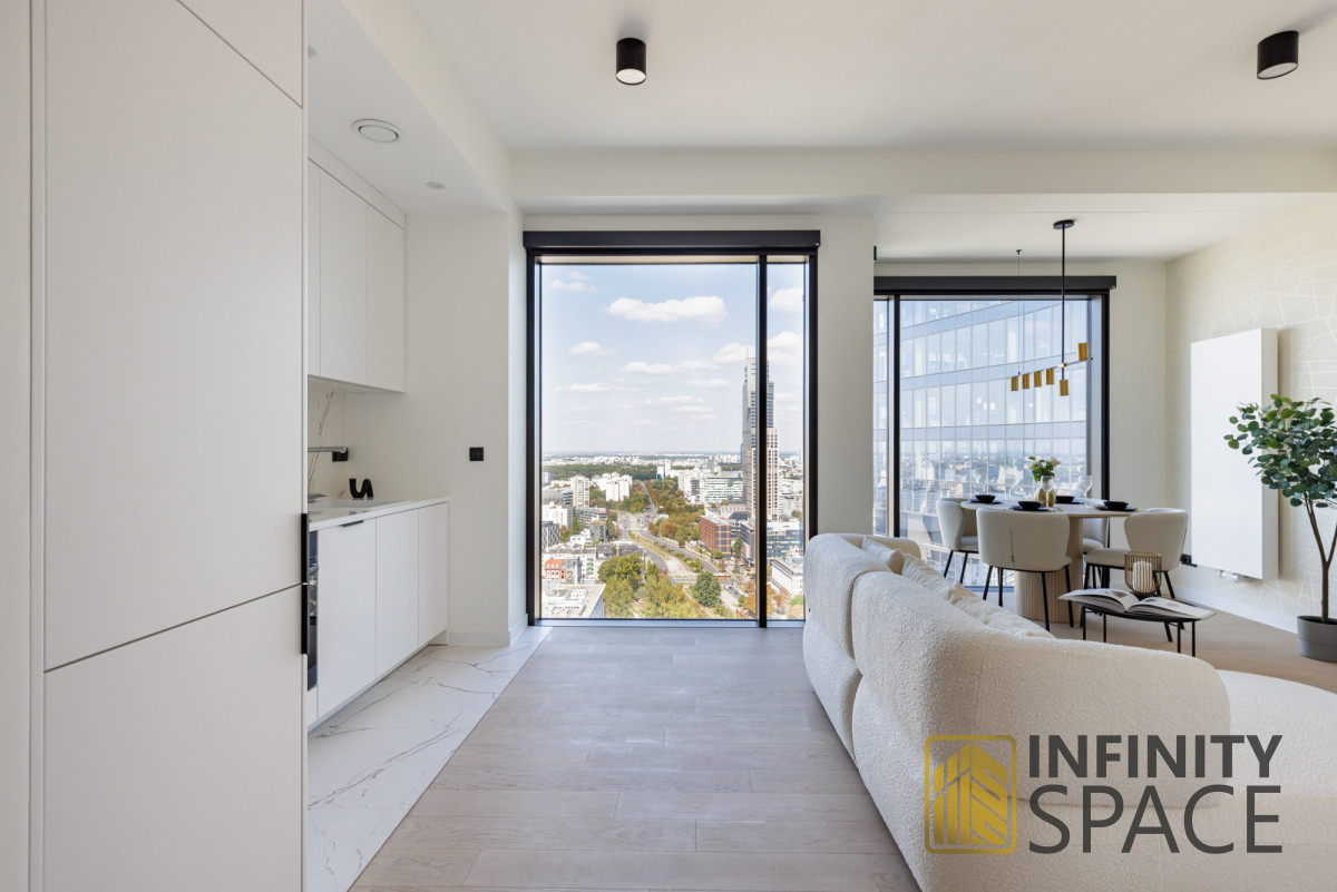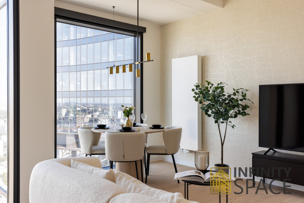 This modern, comfortable, and very elegant 47 sq m apartment is located on the 28th floor of the prestigious 29-story Towarowa Towers development. Its northeastern exposure and large, bright windows guarantee plenty of natural light. The apartment was designed by an interior designer and finished to a high standard, with custom-made joinery made of the highest quality materials. The apartment is very quiet. The apartment is equipped with high-end new appliances. It features an extremely functional layout, air conditioning, and a large TV with SmartTV functionality. No one has lived in the apartment yet.